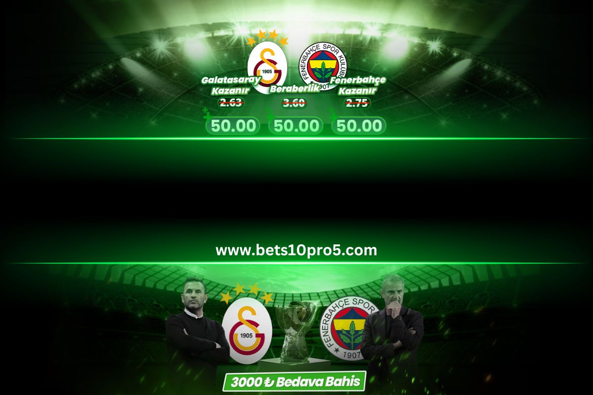Yılın son maçı, son derbisi! Arabistan’da oynanacak Türkiye Süper Kupa Finali’nde heyecan dorukta olacak. Çünkü Bets10 markasının bahis sever üyeleri 50 oranla coşacak. Bets10 maçın içerisindeki neredeyse her bahse 50 oran verdi. İşte o bahisler;