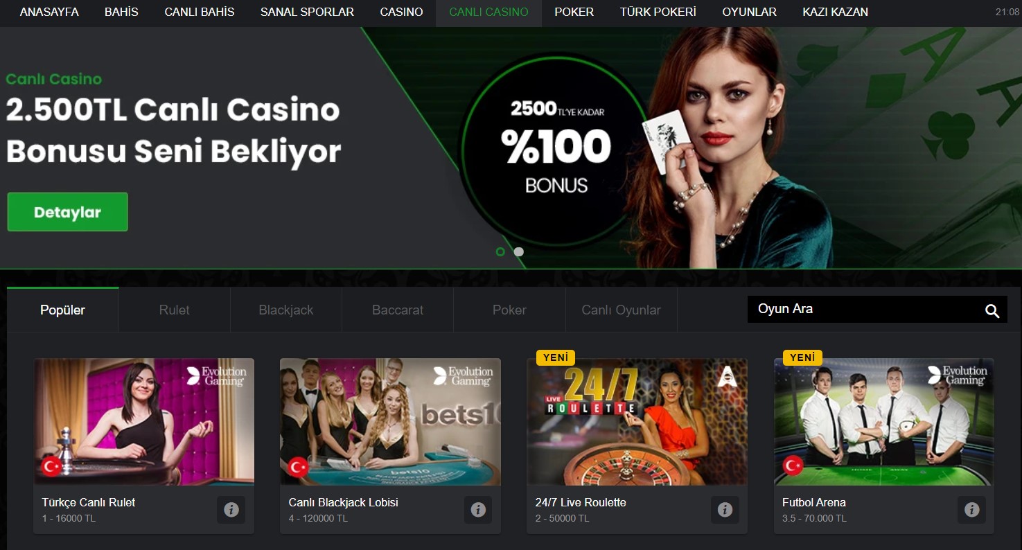 Canlı Casino oyunlarında en güncel teknolojileri kullanan Bets10, gerçek bir casino keyfini evinizdeki bilgisayara ve hatta cep telefonunuza kadar taşımıştır.